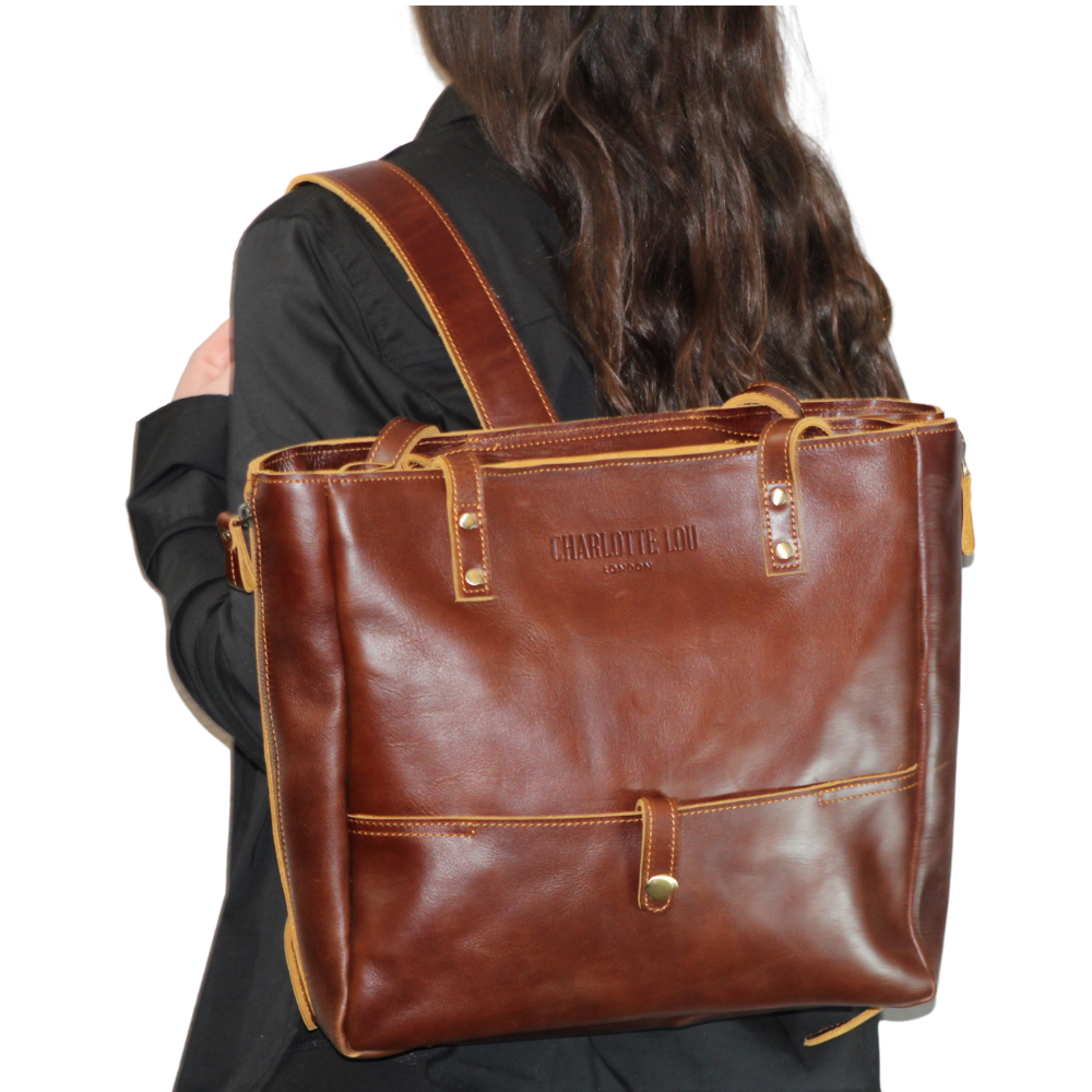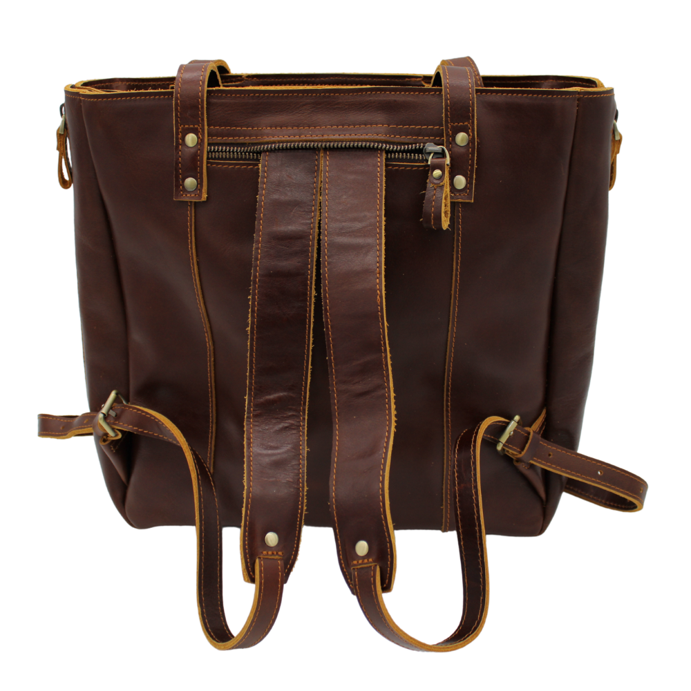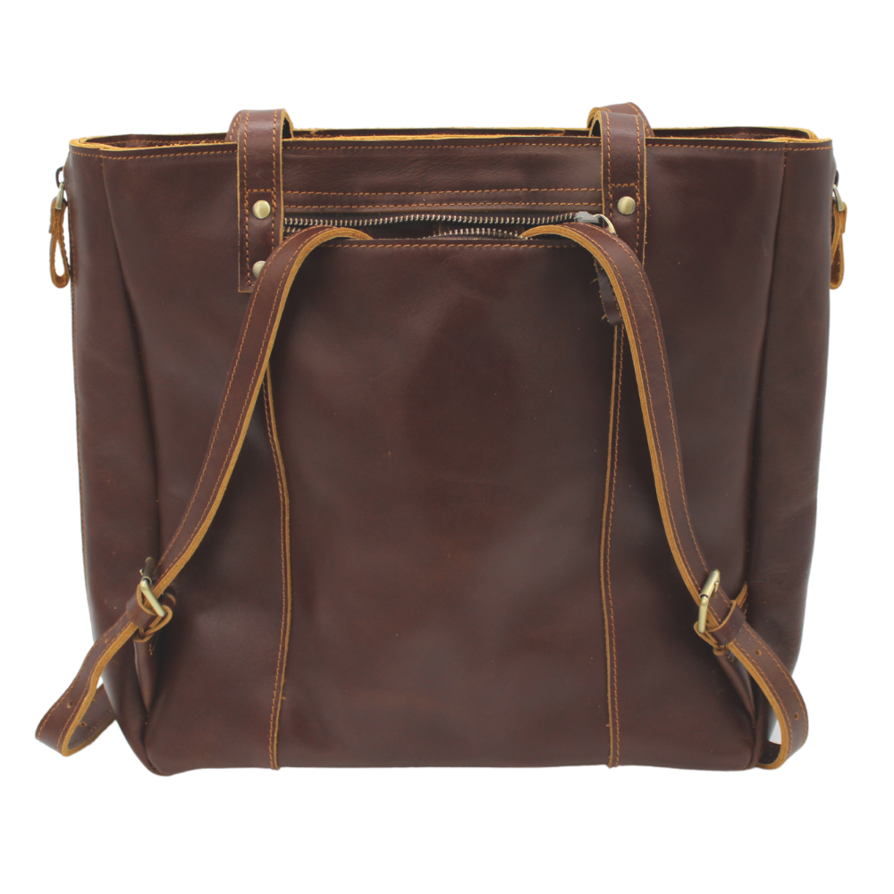 The convertible Hyde Park Backpack Tote is the perfect tote for all of your occasions! This backpack converts from a small tote, to a large tote, to a backpack - nothing is more stylish or convenient. Made from rich brown leather sourced from Columbia, this durable backpack tote will be your favorite go-to bag!